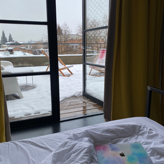 I've stayed in a lot of hostels during my backpacking days and I always think it’s a great way to meet people and have those shared experiences in a way that doesn’t happen in hotels. We booked a private apartment style suite in the hostel, and honestly it exceeded every single expectation. The room had patio doors that covered the full length of the room and opened out onto a large corner balcony that had deckchairs and outdoor seating on our terrace (although the snow meant that we didn't use it as much as we'd have liked to!)
